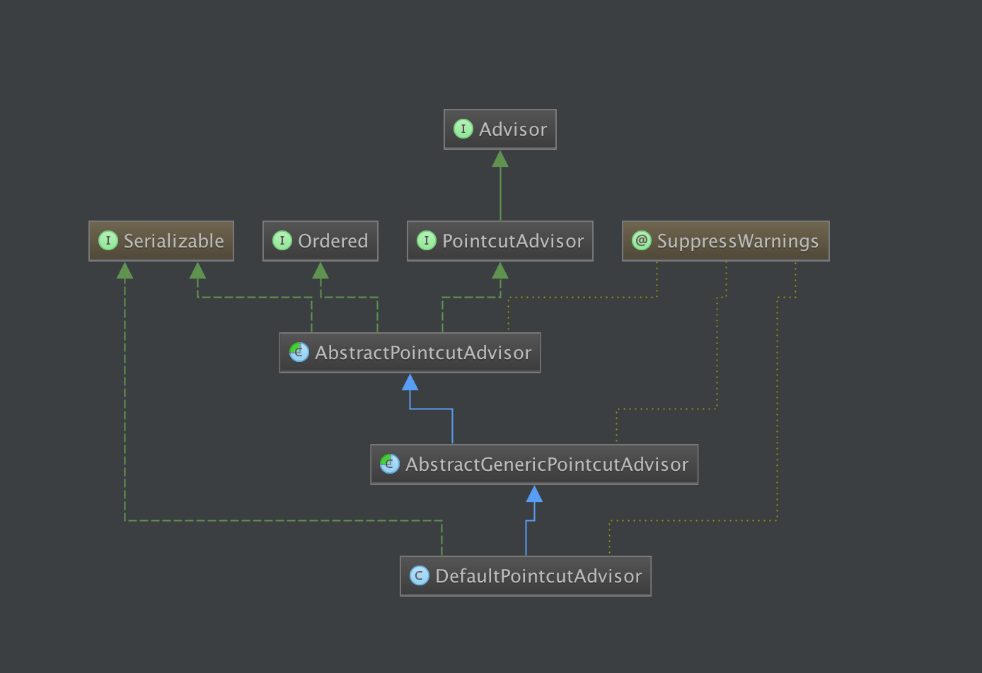 从类图接口继承上看 该默认的Advisor继承了Advisor 和PoincutAdvisor。Advisor是为了组装advice(增强),PointcutAdvisor在Advisor 接口基础上添加了Pointcut,定义了getPointcut接口。DefaultPointcutAdvisor可以看出一个对advisor和pointcut实现了getter/setter接口的类。