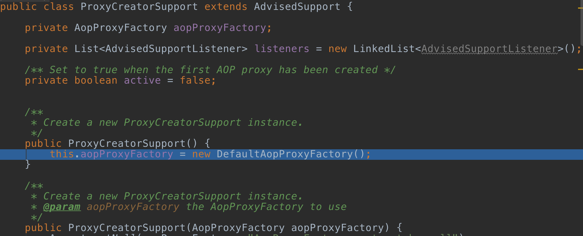首先构造父类ProxyCreatorSupport,前面我们介绍过,主要是增加属性AopProxyFactory,生成一个AopPorxy(用来生产代理)
