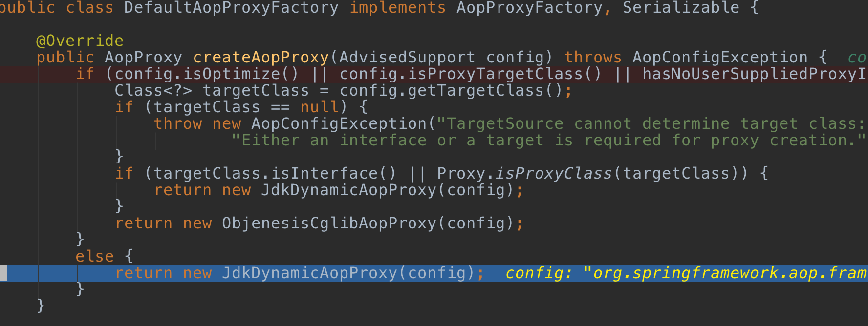 DefaultAopProxyFactory主要是根据有无接口来生产JDK or Cglib AopProxy