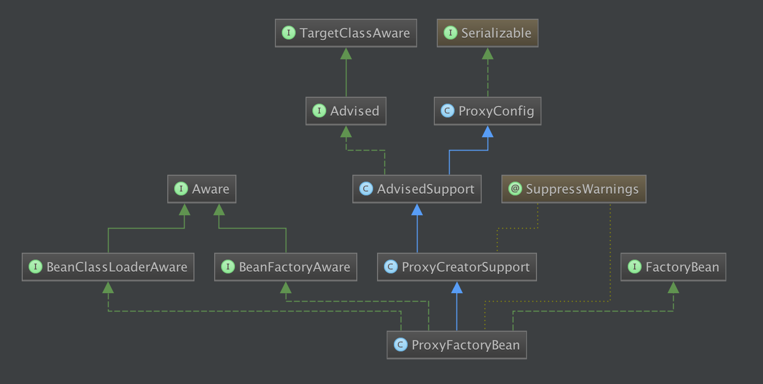 ProxyFactoryBean和ProxyFactory功能一样,只不过ProxyFactoryBean实现了FactoryBean,与Spring IOC容器结合起来了。下面是其类图,它并实现了BeanFactoryAware感知接口,实现BeanFactory的自动注入。与ProxyFactory一样都是ProxyCreatorSupport子类。