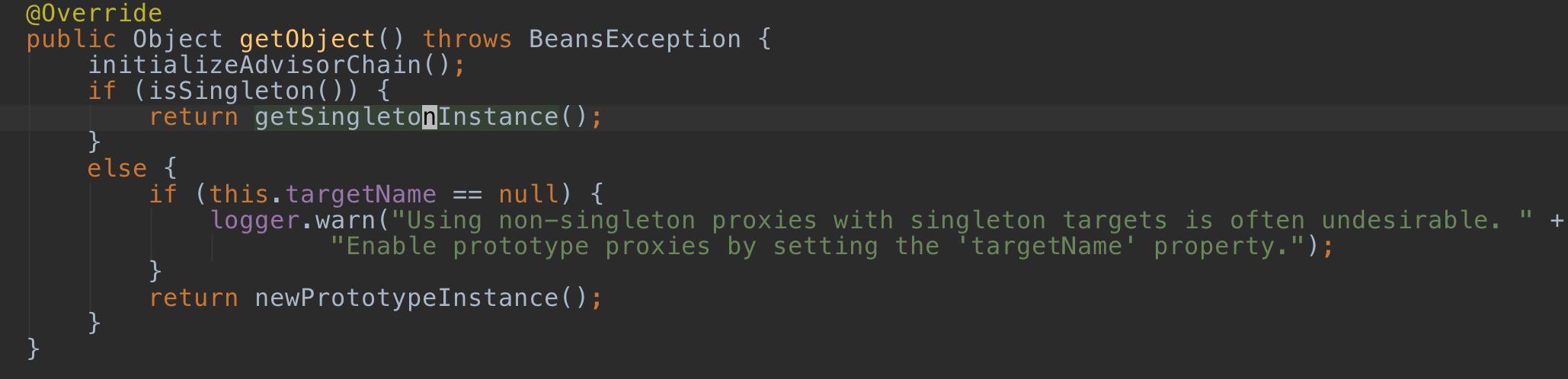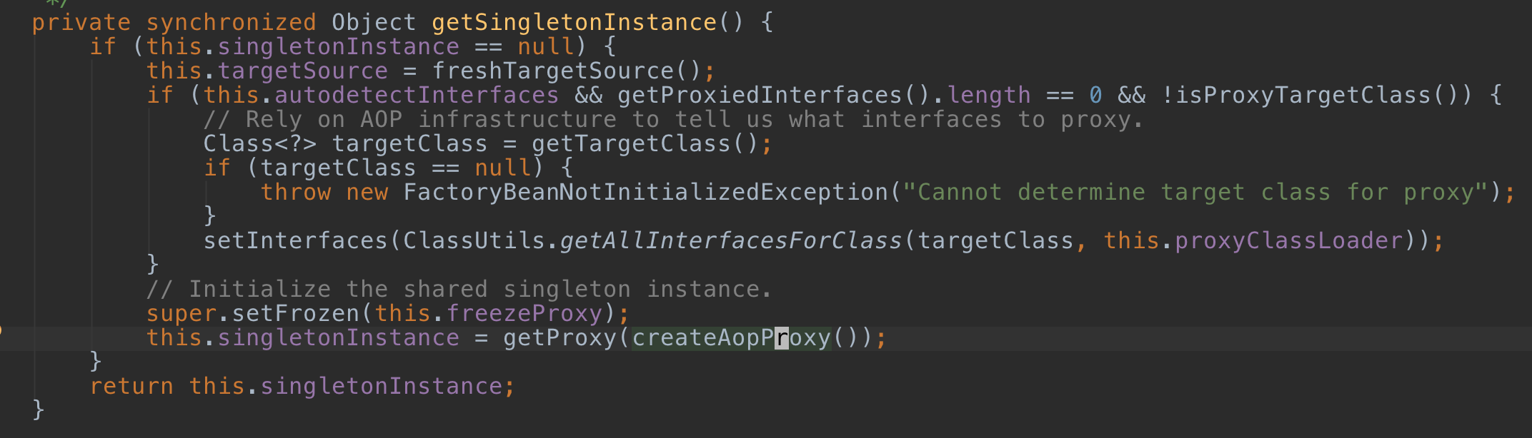 产生单例代理就存下来,下次直接利用。具体过程都是先判处产生 createAopProxy(JDK or Cglib)然后getProxy即可。