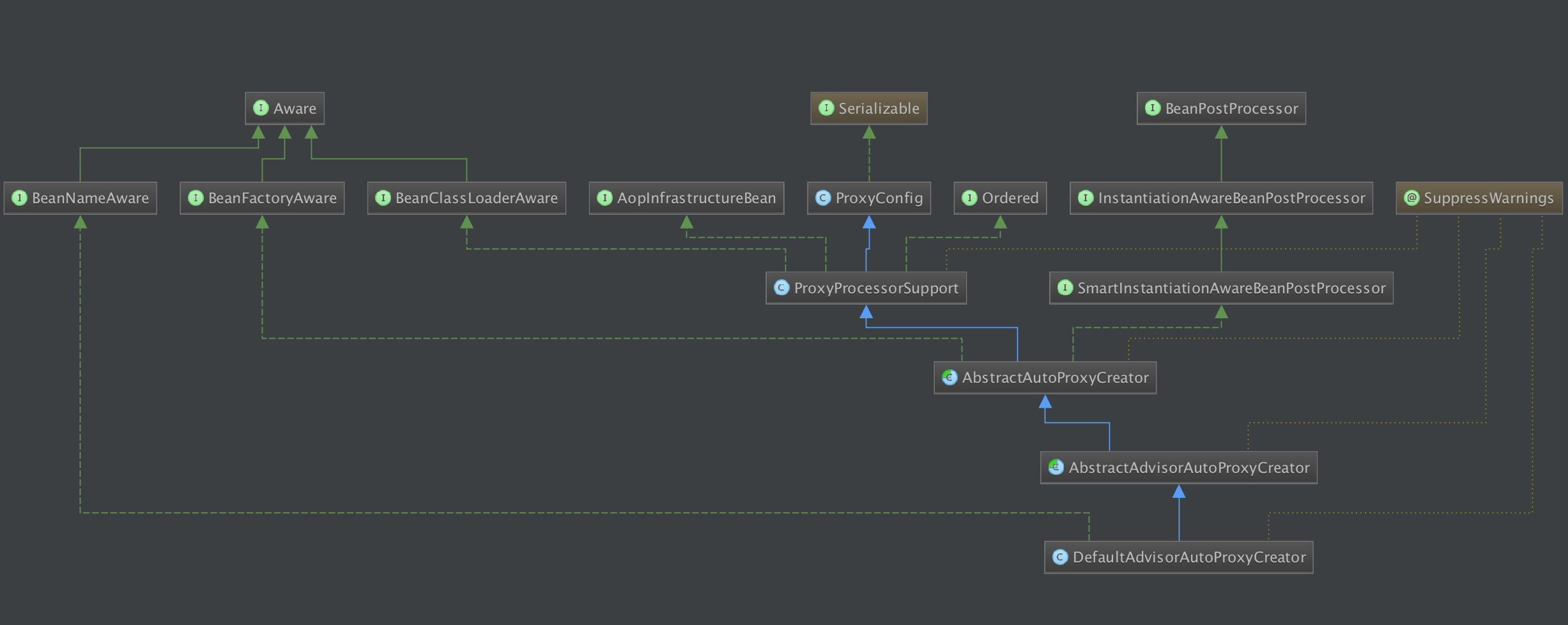 上面我们讲了这么多都是针对一个目标一个目标配置的,如果目标很多怎么办呢?这里Spring IOC容器通过BeanPostProcessor 来实现Aop 代理自动创建,BeanPostProcessor。常见的自动代理创建有BeanNameAutoProxyCreator,DefaultAdvisorAutoProxyCreator。我们看看默认的DefaultAdvisorAutoProxyCreator的类图