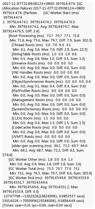 当使用 G1 收集器时,通过 -XX:+PrintGCDetails 参数可以生成最为详细的 GC 日志,通过该详细日志,可以查看到 GC 各个阶段的耗时,为 GC 优化提供便利。然而如果使用的是 ParNew 和 CMS 垃圾回收器,实际上官方并未提供可以查看 GC 各阶段耗时的方法。所幸在 AliJDK 中,提供了类似的功能,通过 PrintGCRootsTraceTime 能打印出 ParNew 和 CMS 的详细耗时。MsgBroker 的 GC 详情日志如下: