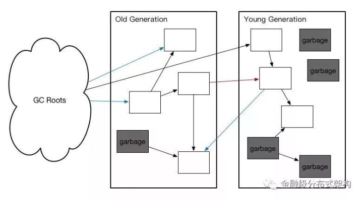 下图大致展示了 YGC 时是如何追踪和标记存活的对象的。图中的箭头表示对象之间的引用关系,其中红色箭头表示老年代到年轻代的引用,这部分对象会被添加到 old-gen scanning 中,而蓝色的箭头表示 GC Roots 或年轻代对象到老年代的引用,这部分对象在 YGC 阶段实际上是无需进行追踪的。