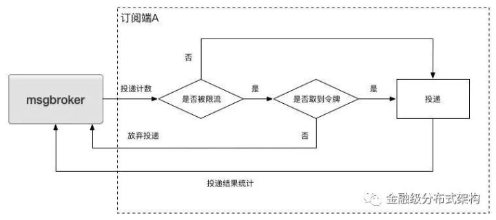 为了解决上述问题,MsgBroker 实现了一种自适应投递限流算法,如下图所示。算法的基本思路就是服务端会不断根据订阅端的消费结果估计订阅端的消费能力,并按照估计出的订阅端消费能力进行限流投递,对于被限流的消息,能够快速失败掉,不必在内存中再停留 10s,同时也无需再执行 DB 更新操作。这样,即保护了订阅端,有利于积压消息的快速消化,也能保护服务端不受订阅端的影响,并进一步降低 DB 的压力。