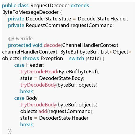 如下面的代码所示,在对消息请求进行 decode 时,RequestDecoder 会首先尝试解析消息的 header 部分,如果 byteBuf 中的数据足够,RequestDecoder 会将 header 完整解析出来,并保存在 requestCommand 中。这样,如果 byteBuf 中的数据不够解析出消息的 body 部分,下次 decode 时也可以直接从 body 部分开始,降低重复读取的开销。