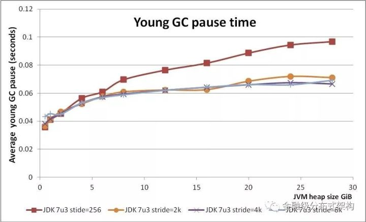默认情况下,ParGCCardsPerStrideChunk 的值为 256,由于每个card 对应 512 字节的老年代空间,因此在扫描时每个区域的大小为 128KB,对于 4GB 的堆,会存在超过 3 万个区域,比工作线程数足足高了 4 个数量级。下图即为将ParGCCardsPerStrideChunk参数分别设置为 256,2K,4K 和 8K 来运行 GC 基准测试[1],结果显示,默认值 256 在任何情况下都显得有些小,并且堆越大,GC 停顿时间相比其他值也会越长。
