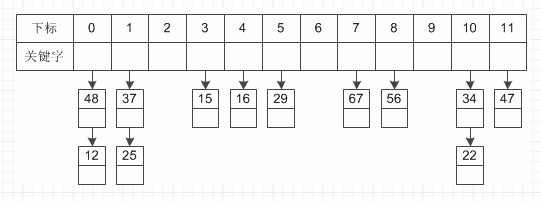 这种方法的基本思想是将所有哈希地址为i的元素构成一个称为同义词链的单链表,并将单链表的头指针存在哈希表的第i个单元中,因而查找、插入和删除主要在同义词链中进行。列如对于关键字集合{12,67,56,16,25,37, 22,29,15,47,48,34},我们用前面同样的12为除数,进行除留余数法:
