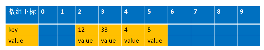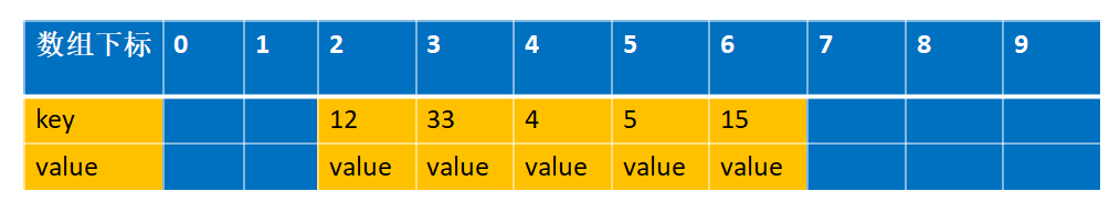 当计算前S个数{12,33,4,5}时,都是没有冲突的散列地址,直接存入(蓝色代表为空的,可以存放数据):