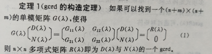 4)如果R(λ)是n*n和m*n的多项式矩阵D(λ)和N(λ)的一个gcrd,则R(λ)可以表示为: