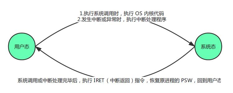 指令分为特权指令(只能由操作系统内核使用的指令)和非特权指令(只能由用户程序使用的指令),因为指令有特权和非特权之分,所以 CPU 也分为 2 种执行模式:系统态(可以执行所有指令,使用所有资源以及改变 CPU 状态)和用户态(只能执行非特权指令)。
