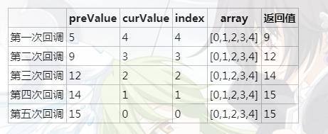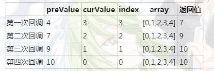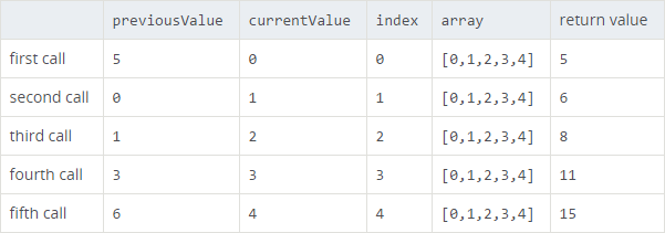 reduce还有第二个参数,我们可以把这个参数作为第一次调用callback时的第一个参数,上面这个例子因为没有第二个参数,所以直接从数组的第二项开始,如果我们给了第二个参数为5,那么结果就是这样的: