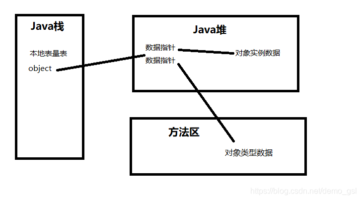 Object object是放在Java栈中的本地变量表中。new Object()是放在Java堆中。如果这个类还有其他类型(比如父类、实现的接口、方法等)放在方法区中。如图下图所示: