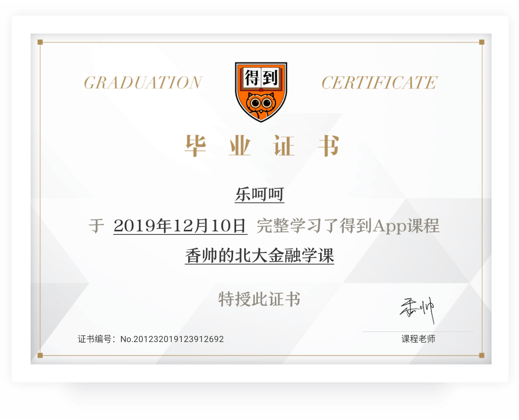 自从2019年11月11日在得到APP上购买“香帅的北大金融学课”开始,一直到2019年12月10号也就是今天为止,我学习了整整一个月的时间,今天终于“毕业”了。
