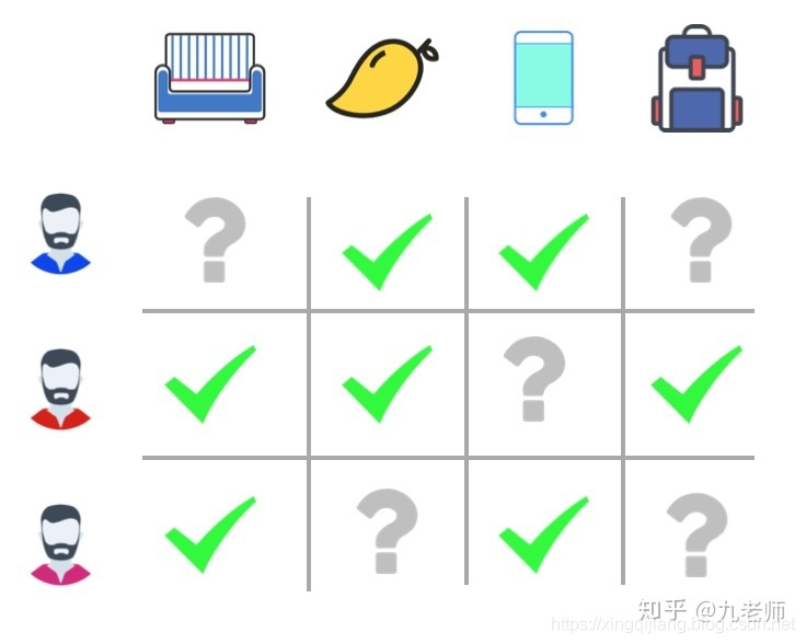 在脑中想象一个二维的表格,每一行代表一个用户,每一列代表一个物品,表格里的每一个点代表用户对物品的操作,这个操作可以是评分,点击,点赞。其中,有些格子记录了行为,有些格子是空的。到这里,我们就建立了基本的矩阵视角,推荐问题转化成了如何补上那些空格子。