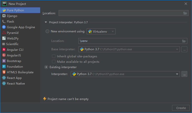 这种方式非常简单,只需要选择一个目录,PyCharm会自动创建工程。 -