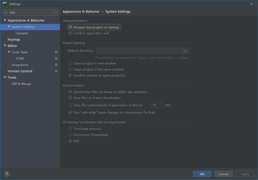 - 你是不是对PyCharm默认打开上次工程的行为感到反感?在【File】菜单中选择【Settings】,在弹出的对话框中搜索last,如图: