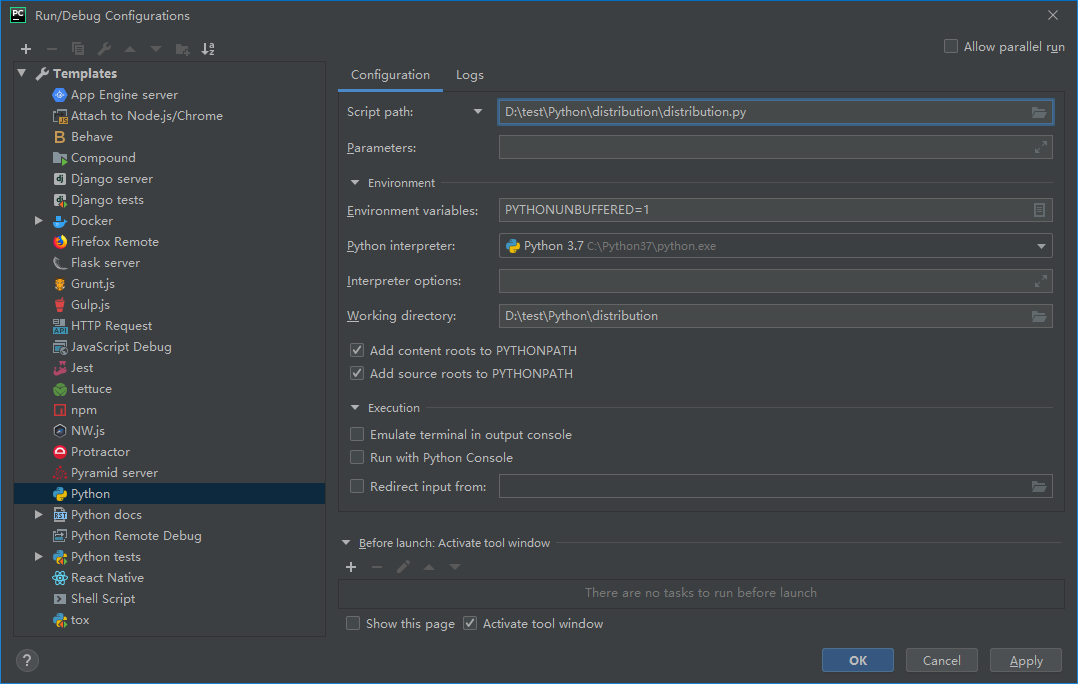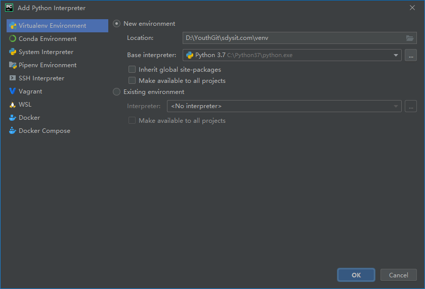 - Virtualenv Environment: 可添加通过virtualenv创建的Python虚拟环境