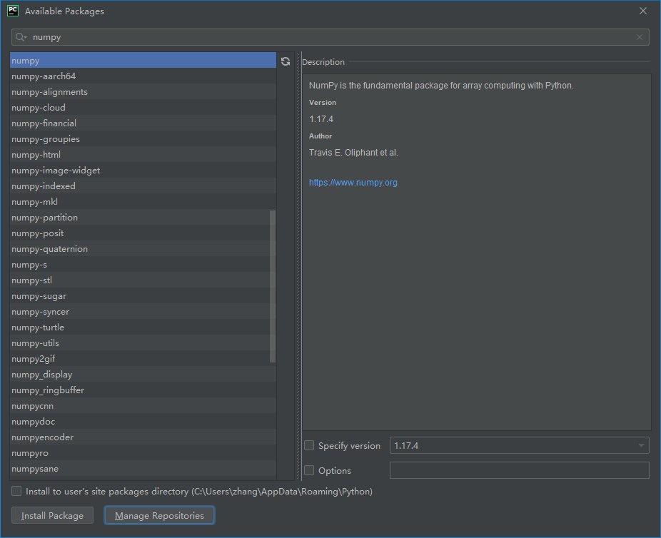 上方可输入模块名称进行搜索,搜索显示在列表中,选择列表中的模块,点击下方的【Install Package】即可安装。