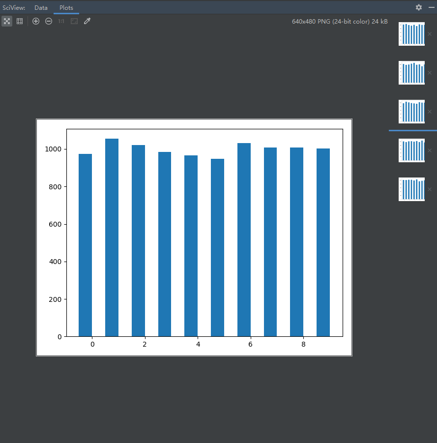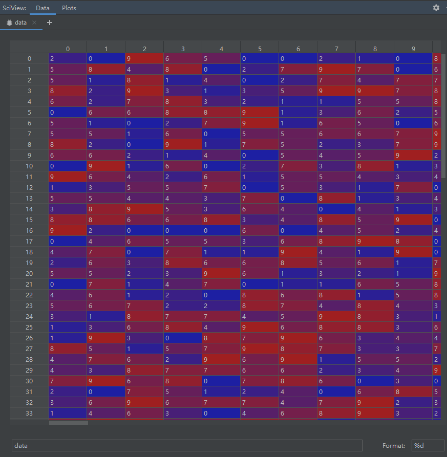 【SciView】窗口有两个Tab页,【Data】用于查看numpy数组的值,【Plots】用于查看matplotlib绘图。