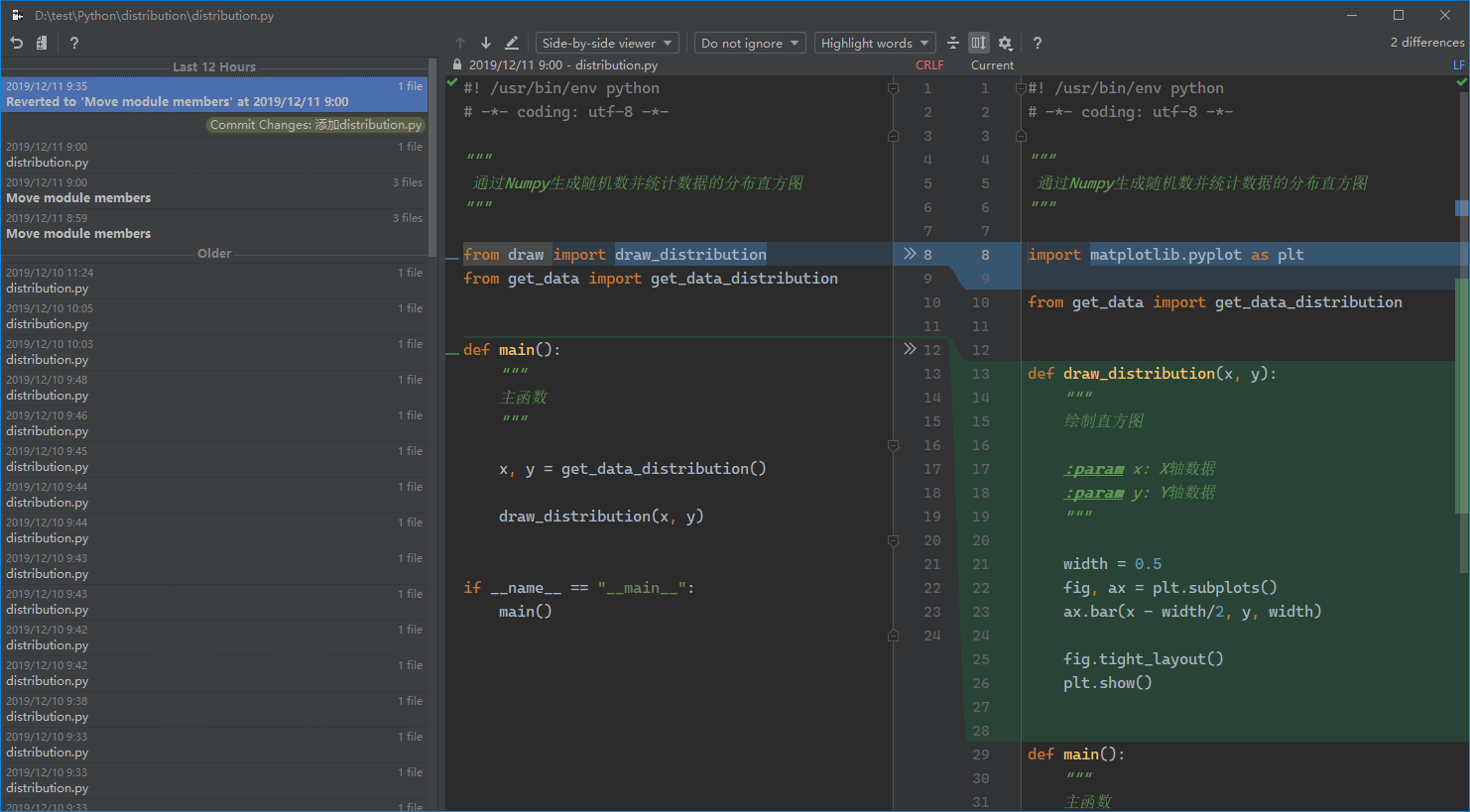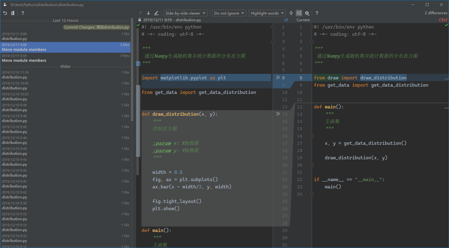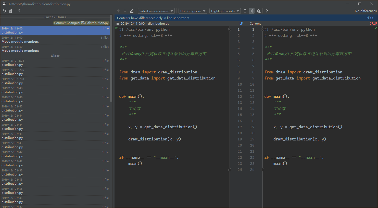 左侧显示出了我文件的修改历史,真是不看不知道,一看吓一跳,原来我已经修改过那么多次了。而且,我使用PyCharm和重构功能也被标记了出来,真是太赞了。