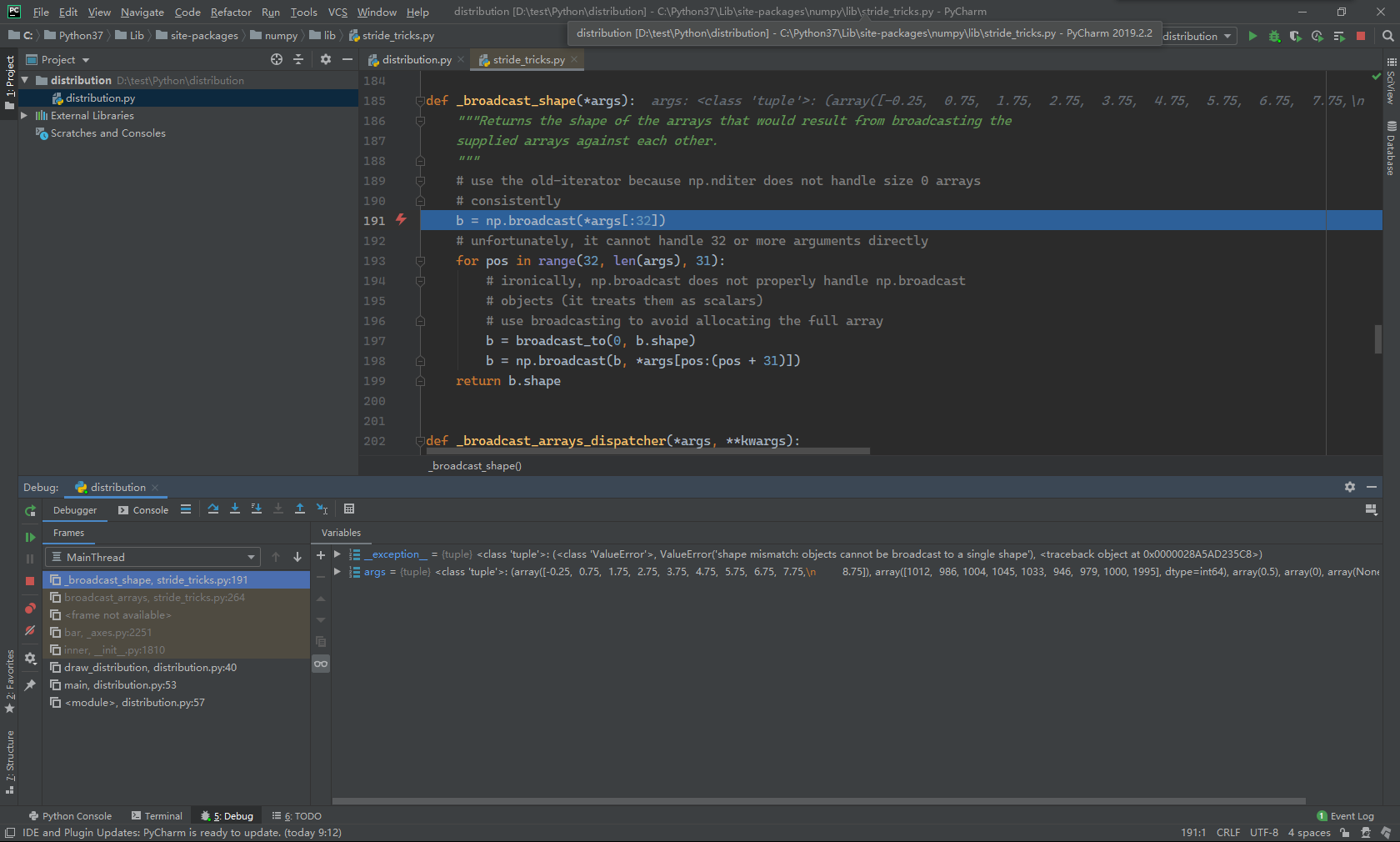 启动调试后,PyCharm捕获了异常,并自动中断。