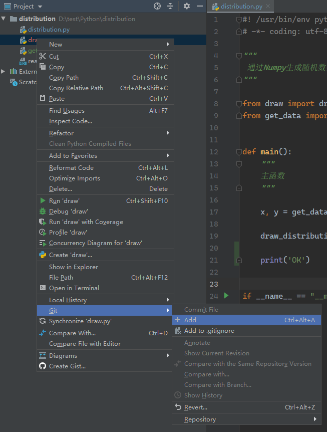 想要将文件添加到版本控制,可以在工程树上右击该文件,选择【Git】->【Add】