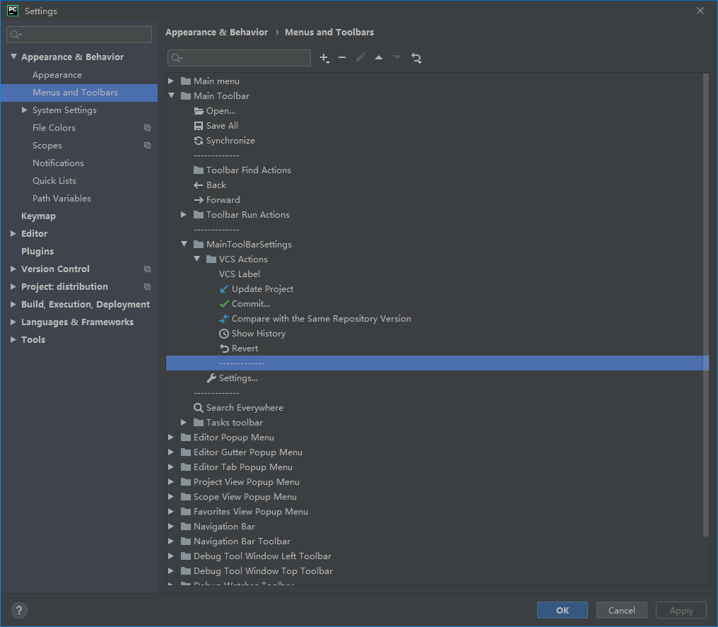 在设置里找到【Menu And Toolbars】->【Main Toolbar】->【Main Toolbar Settings】->【VCS Actions】,并点击想要添加的位置: