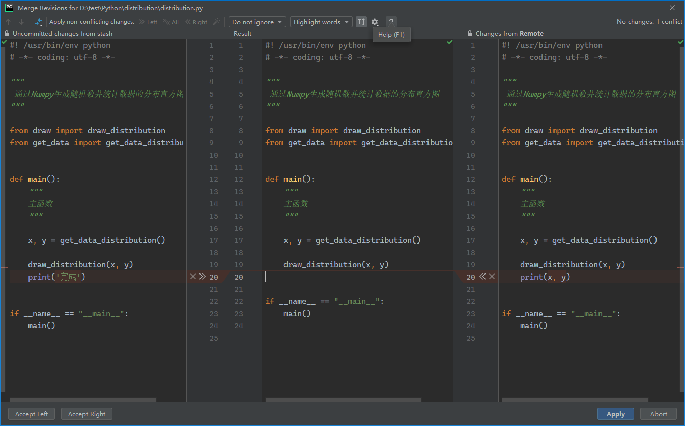 这个窗口最左侧显示你的代码,最右侧显示别人的代码,中间为合并后的代码。你可以点击【>>】、【<<】将代码合并,点击[X]放弃某处修改,完成后点击【Apply】即可。 -