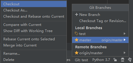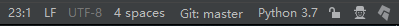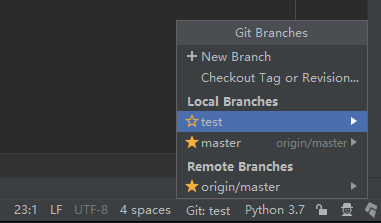 在PyCharm右角的状态栏中,显示了当前的分支: