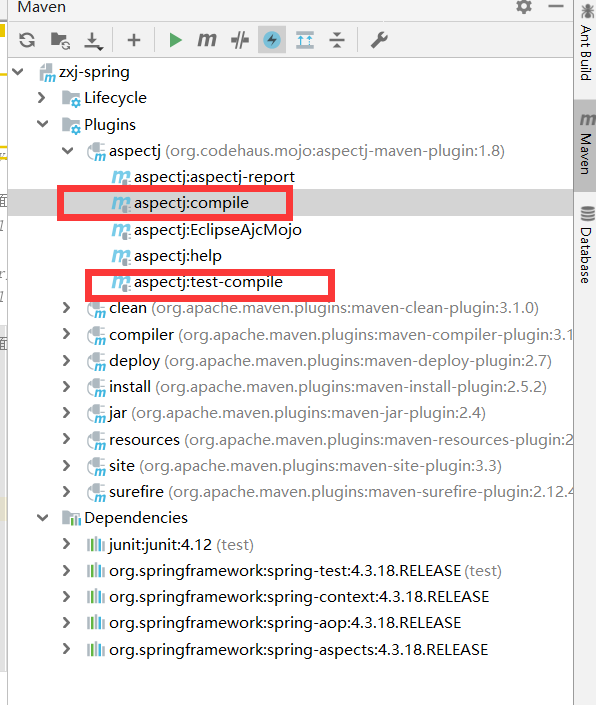插件aspectj-maven-plugin可以将.aj文件编译成.class文件,否则会提示找不到切面类的信息。可以对下载的插件aspectj-maven-plugin进行测试,双击idea右侧maven中的aspectj:compile或者aspectj:test-compile。如果下运行正常,即为成功。否则,要到maven仓库中将下载不全的包删除了,重新下载。