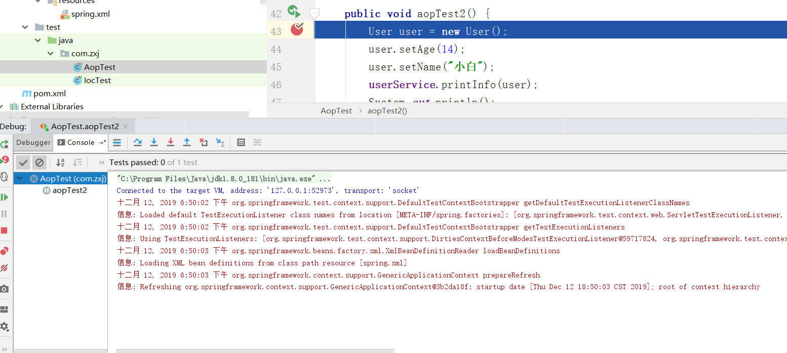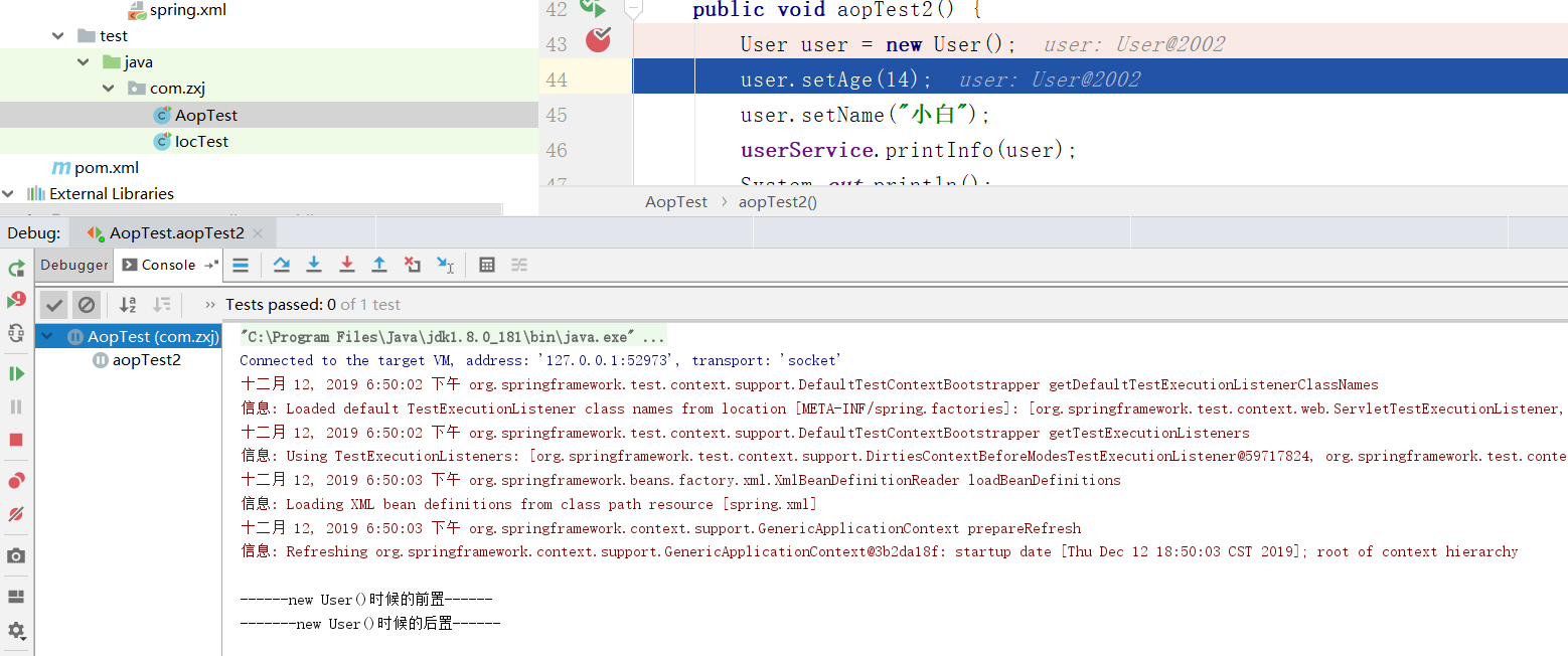 2、我们在切入点为构造方法,即new User()的地方打下断掉。发现程序运行到这里的时候,没有打印任何日志。