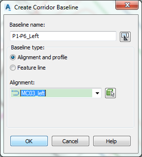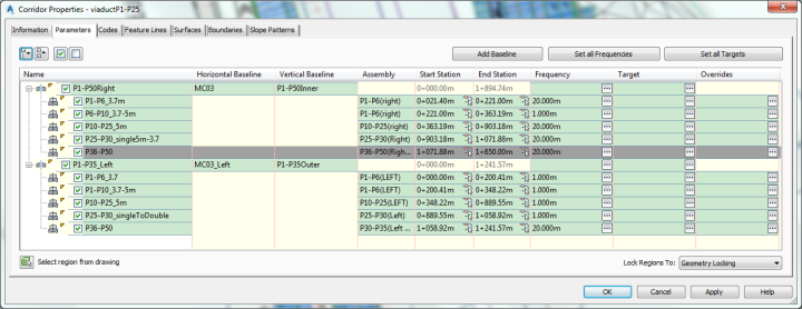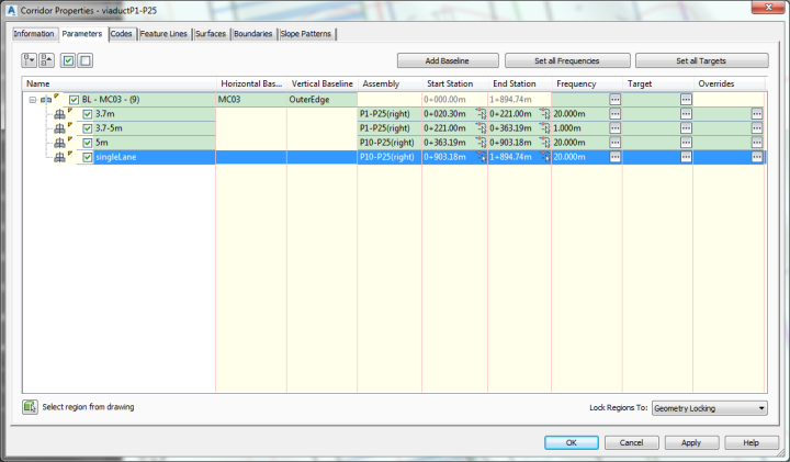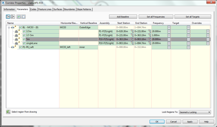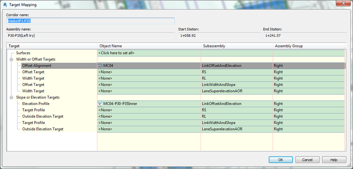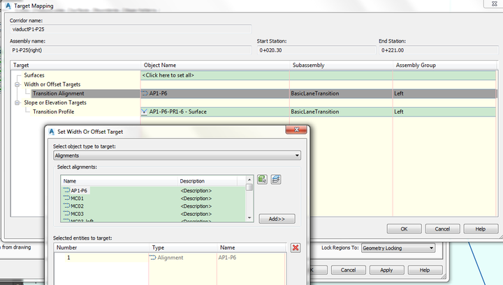 然后在第一行3.7米那一栏的目标列里,点击点点点,然后打开目标匹配话框,选择P1-P6的alignment 作为目标对象,添加,确定,确定,重建廊道,其他的区域也这样做。
