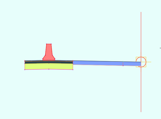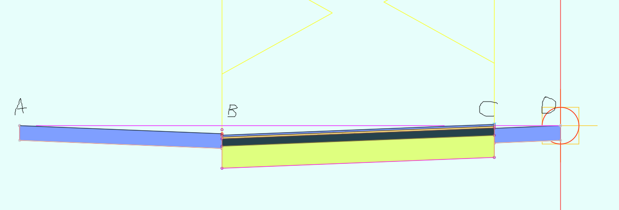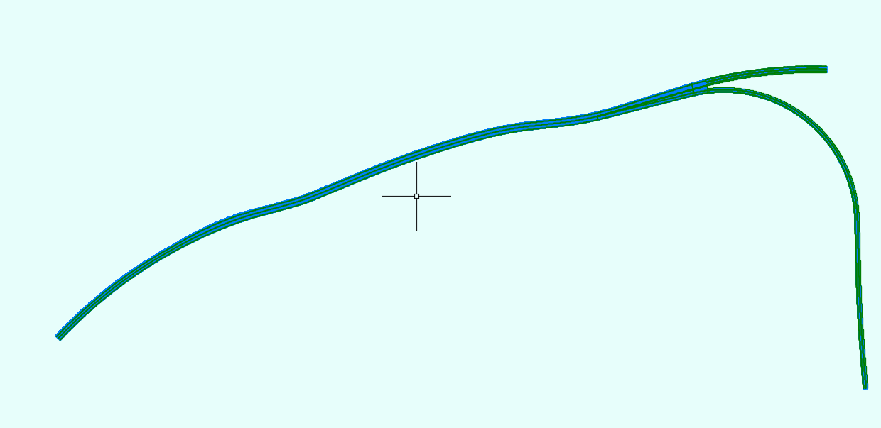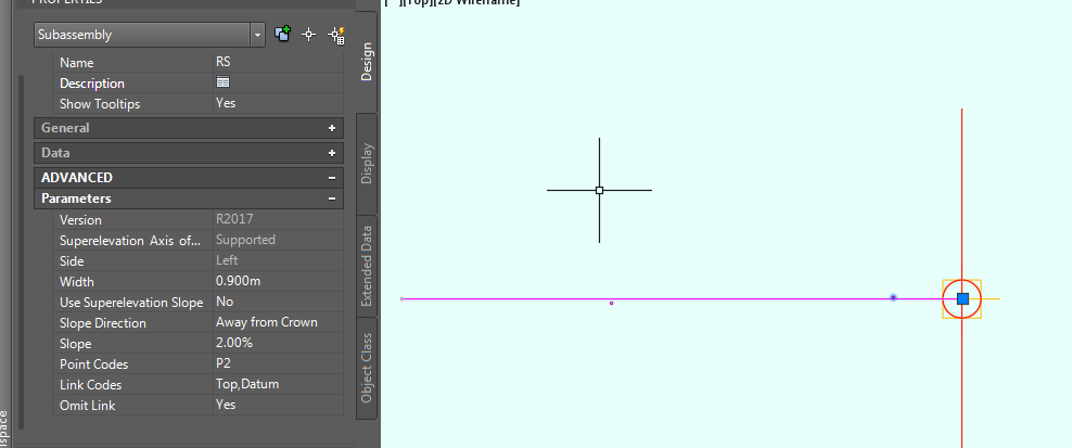 上回书说道,这个路经常变来变去的,一会汇合一会分叉。本来只要把路两边的路肩所在的基准线设定好高程和走势就行了,但是路肩又是不变的,而且自带的路肩没有elevation target , 不能锚定高程线。里面的车道倒是有target,但是给定的高程线是路肩的又不是车道的,不能去锚那个。所以我本来打算用Subassembly composer 做,以路的内线为基准线,外线设定target 去锚定高程线。像这样。