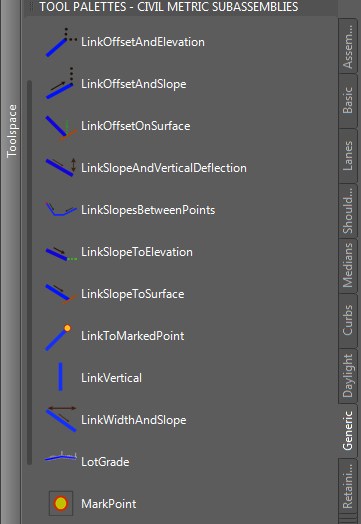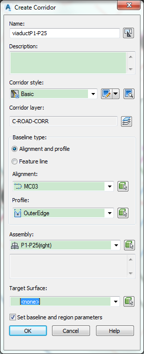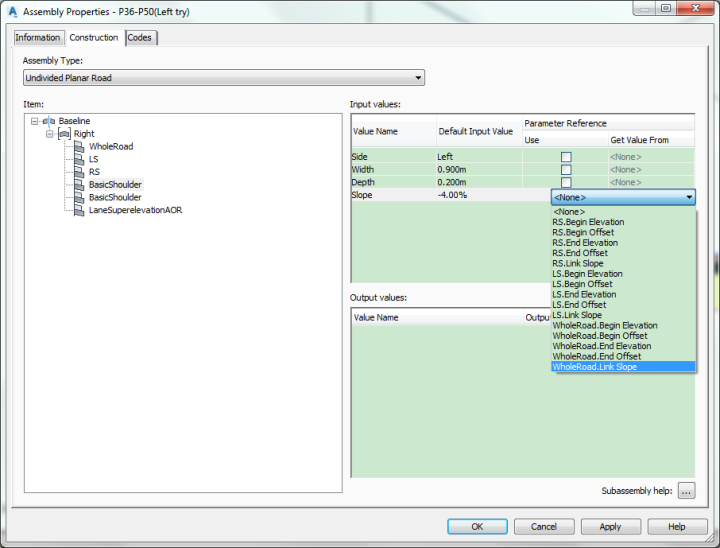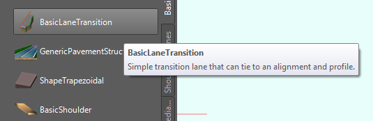 首先当然是需要路的两个边界线的alignment(中文软件里这个到底叫啥?)还有profile(高程),然后分别以边界线所在的alignment做为原点新建装配,车道选择BasicLaneTransition,路肩就BasicShoulder,按照设计要求改好参数。