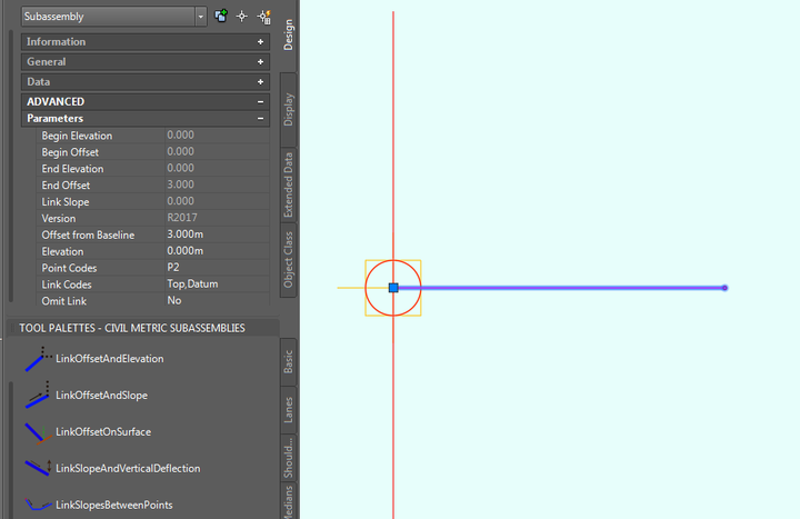然后现在开始分别点开每个部分的目标,水平偏移和纵向高程选择相应的中心线和中心线所在高程。对于没有单车道的路,因为设计装配的时候就设计要连对面,所以把LinkOffsetElevation对应好对侧的线就可以了。