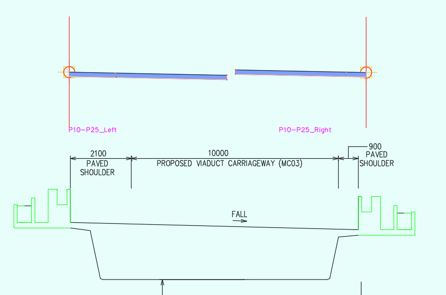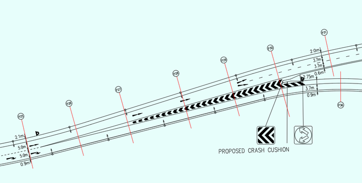 到这里都还比较简单。但是从P25开始,左右车道开始分叉,并且在P30处完全分开,中间的路肩变成了可变宽度,而且还有路障;从P30分出去以后,两条车道宽度逐渐变成3.7米,其中左车道又分叉了。