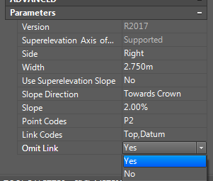 接下来,选LinkWidthAndSlope, 顾名思义,已知坡度和宽度的线。坡度就是刚才那个输出,现在还不知道就随便给一个初始值。宽度就是第一个路肩的宽度,2.75m。 注意最后一行省略连接要选是。命名LS(LeftShoulder)