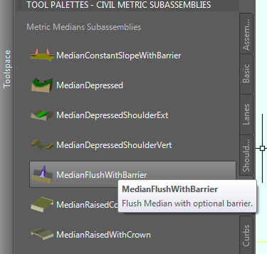 这个地方就比较复杂了。刚才的装配通通不能用,要建新的。我们一点一点看。首先先看右面这个单车道,从P25到P30 这段比较简单,除了0.9m的路肩还有3.7m的车道外,再把中间那个可变的这个过渡地带加进来,这个过渡带选择MedianFlushWithBarrier, 这个部件有左右offset target,可以通过左右两条线来自适应其宽度。