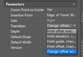 之所以选BasicLaneTransition是因为这个车道可以根据alignment 或者 特征线更改自己的偏移和高程,记得要在过渡这里选好 “改变偏移和标高”