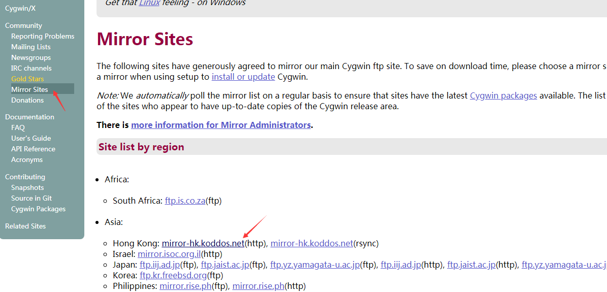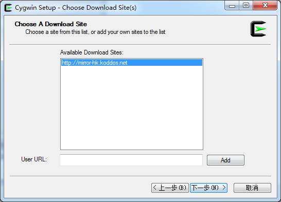下一步,出现一个界面,让你添加地址,你打开官网,选择mirror sites,点击下面的 Hong Kong(http://mirror-hk.koddos.net/cygwin/)
