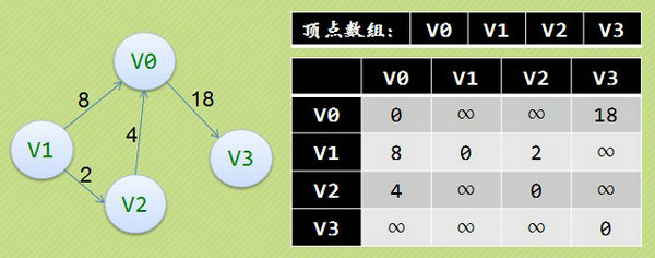 可见顶点数组vertex[4]={V0,V1,V2,V3},弧数组arc[4][4]也是一个矩阵,但因为是有向图,所以这个矩阵并不对称,例如由V1到V0有弧,得到arc[1][0]=1,而V0到V1没有弧,因此arc[0][1]=0。