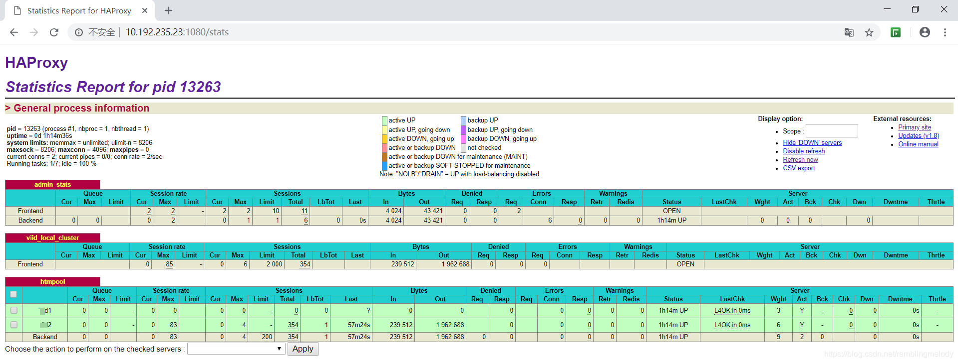 3、管理页面展示,地址为安装Haproxy的主机地址,路径类似如下:10.192.235.23:1080/stats;