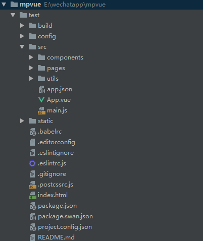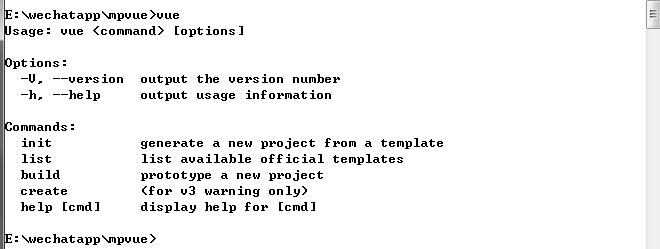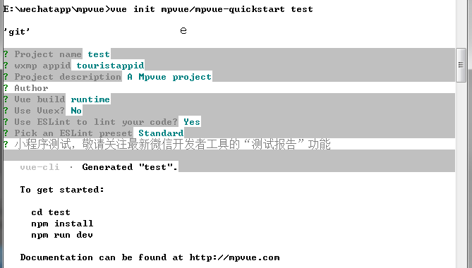 (3)mpvue使用vue-cli构建工具,其中使用了一个vue模板,此模板用来支持mpvue的项目小程序的生成,使用如下代码可以新建一个mpvue的工程。