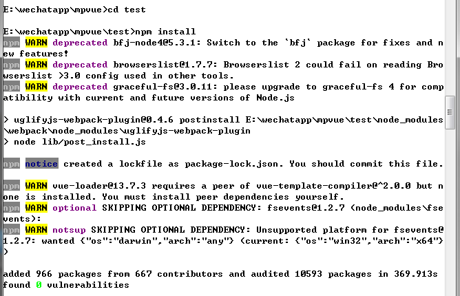 (5)在此工程中并没有安装项目的依赖项,所以需要使用cd命令进入该项目文件夹,再使用npm install安装JavaScript依赖,安装过程如图10-5所示。