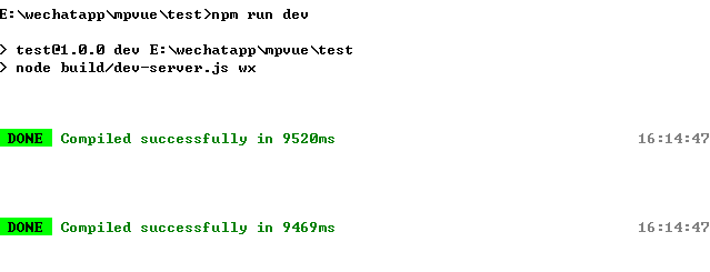 (6)这样,一个完成的小程序项目就已经完成了,和WePY工程一样,mpvue也无法直接运行在小程序环境中,需要使用相应的编译。使用如下命令编译工程,效果如图10-6所示。