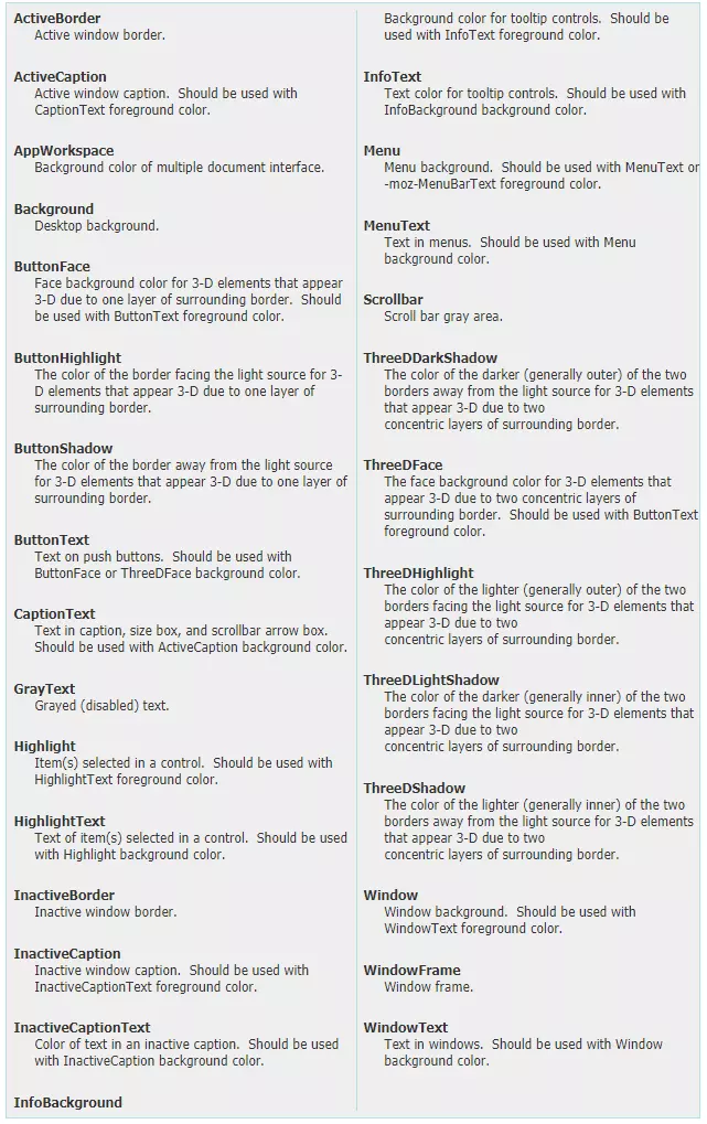 系统颜色就是系统的颜色,不同的系统支持的颜色可能不同,一般很少使用。但是我们可以利用它实现系统主题风格类似的 Web 组件皮肤效果,来以假乱真。