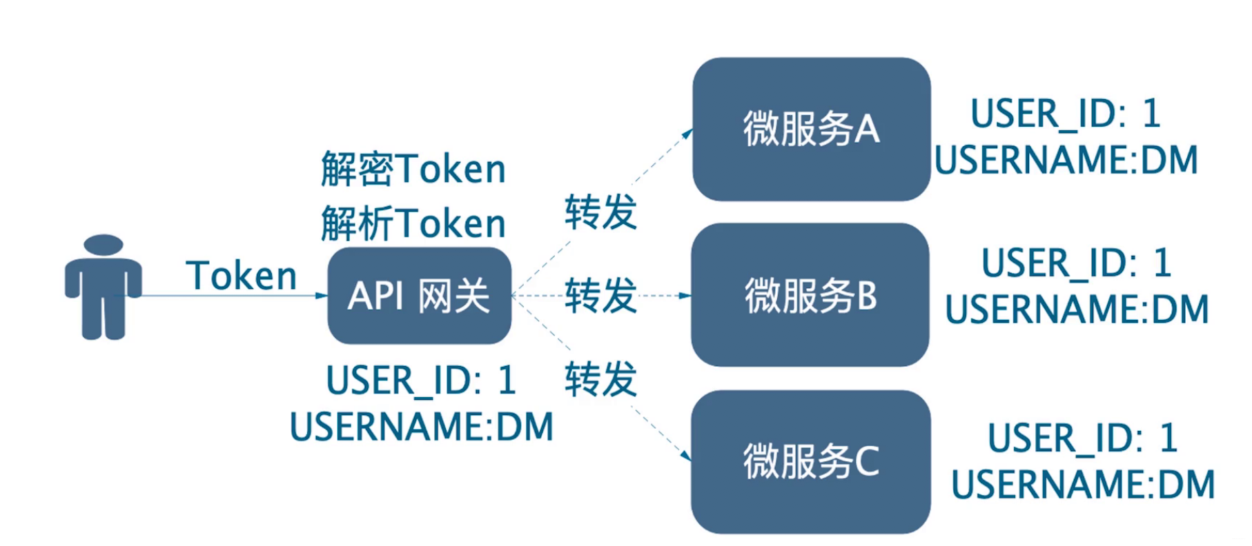 登录成功后,网关颁发token,之后用户的每个请求都会携带该token,网关对其解密是否合法,过期等,token中会携带用户信息,所以网关还可解析token即可知道用户是谁,比如解析出了id和name,就会将其加入请求的header中进行转发,每个服务就知道是啥子用户啦!