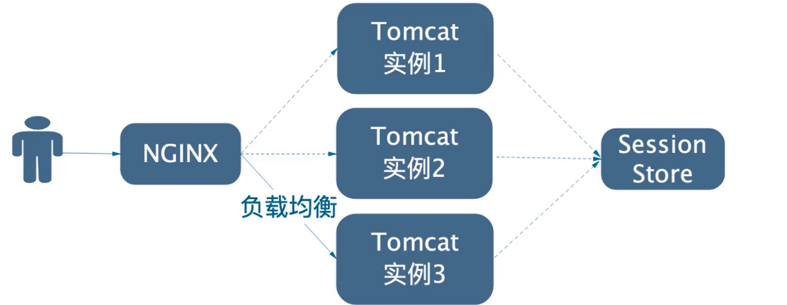 也可使用粘性会话,即:对相同IP的请求,NGINX总 会转发到相同的Tomcat实例,这样就就无需图中的Session Store了。不过这种方式有很多缺点:比如用户断网重连,刷新页面,由于IP变了,NGINX会转发到其他Tomcat实例,而其他实例没有Session,于是就认为用户未登录。这让用户莫名其妙。 > 粘性会话不是本章重点,如果感兴趣可以百度一下(用得越来越少了)