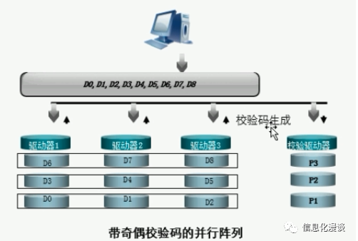 3、Raid3是Raid0的升级版,支持校验:将数据分别写入不同的磁盘,最后有一块单独的校验磁盘,任何一块磁盘损坏都能找回数据。缺点非常明显:1 是同时只能坏一块磁盘,同时两个以上磁盘坏则无法数据找回。2是校验盘的负载很重,任何磁盘发生数据修改,校验盘都需要进行对应修改操作。主要应用场景:在真实项目中基本不用。三块硬盘即可支持配置。